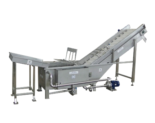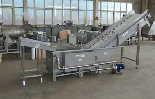 該設(shè)備為果蔬加工生產(chǎn)線關(guān)鍵設(shè)備之一,用于果蔬的清洗提升作業(yè)。該清洗機(jī)是以風(fēng)機(jī)風(fēng)力使水產(chǎn)生強(qiáng)烈攪拌運動, 使物料在水中翻滾, 特殊物料增加翻爪結(jié)構(gòu),提高清洗效果,同時安置在進(jìn)料口的高壓水管噴頭將物料用水力推向提升機(jī)方向,經(jīng)清洗的果蔬由提升機(jī)輸入下道工序。該設(shè)備為果蔬汁生產(chǎn)線中必備機(jī)械,廣泛適用于蔬、果的清洗,使用方便,節(jié)水效果顯著。