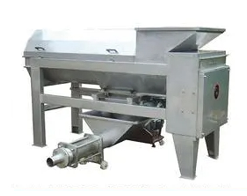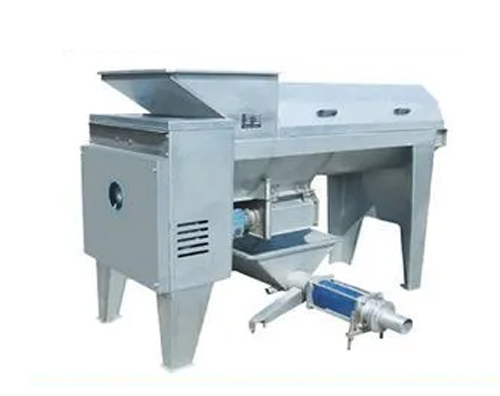 石榴從進料斗進入上破碎裝置,上破碎裝置將石榴壓開,兩輥間隙為20毫米,然后進入下破碎裝置,下破碎裝置再次將石榴擠壓,兩輥間隙為10毫米,經(jīng)過兩級擠壓的石榴已基本皮籽分離,并落入分離裝置,在攪拌軸的攪拌下,石榴籽從篩孔落下,石榴皮從尾部排出,上下破碎輥為彈性結(jié)構(gòu),間隙可調(diào)。石榴籽及汁用螺桿泵送至壓榨機。