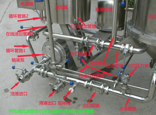 過(guò)濾時(shí),首先在過(guò)濾盤上形成硅藻土預(yù)涂層。被過(guò)濾的液體經(jīng)硅藻土預(yù)涂層時(shí),其中的雜質(zhì)即被阻擋;而純靜的液體經(jīng)過(guò)微觀管狀或片狀的間隙以及顆粒之間的間隙通過(guò)過(guò)濾層,從而起到過(guò)濾作用。隨過(guò)濾時(shí)間的推移,在預(yù)涂層上被濾掉的雜質(zhì)會(huì)越來(lái)越多,且將阻塞過(guò)濾通道。因此在過(guò)濾過(guò)程中,還需對(duì)進(jìn)入過(guò)濾罐的被過(guò)濾的液體,添加一定劑量相應(yīng)粒度的硅藻土,以維持正常的過(guò)濾過(guò)程。另外,如果過(guò)濾時(shí)需要脫色,還需加入一定比例的活性炭。